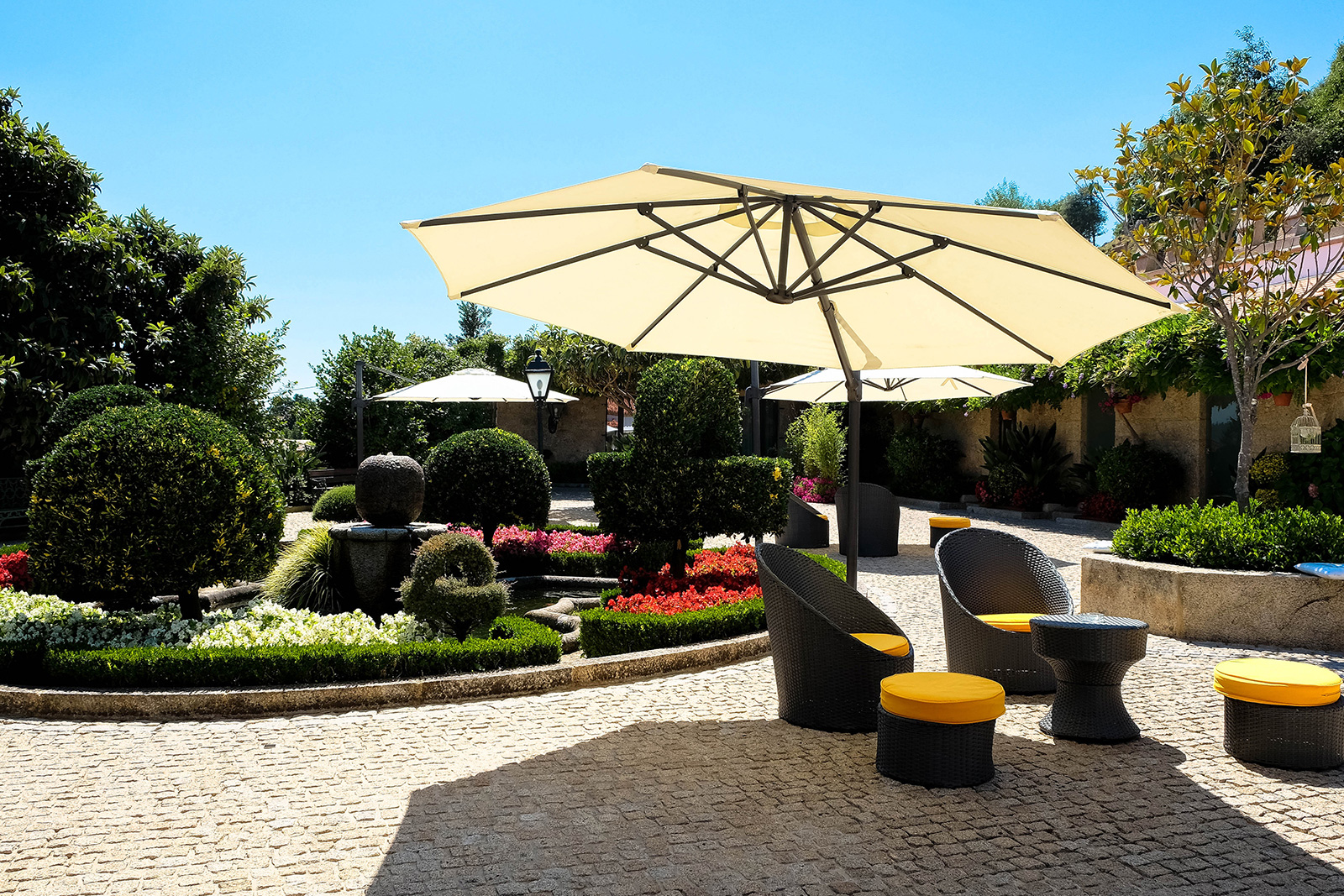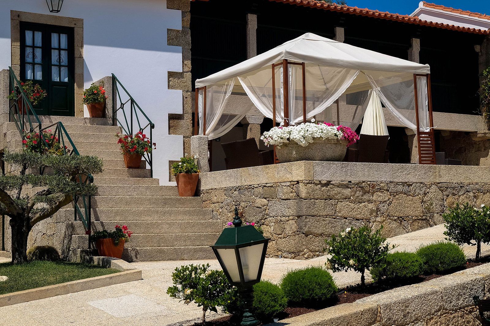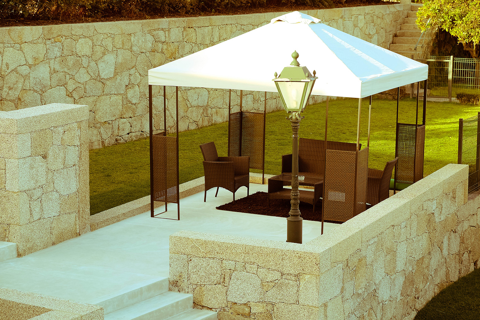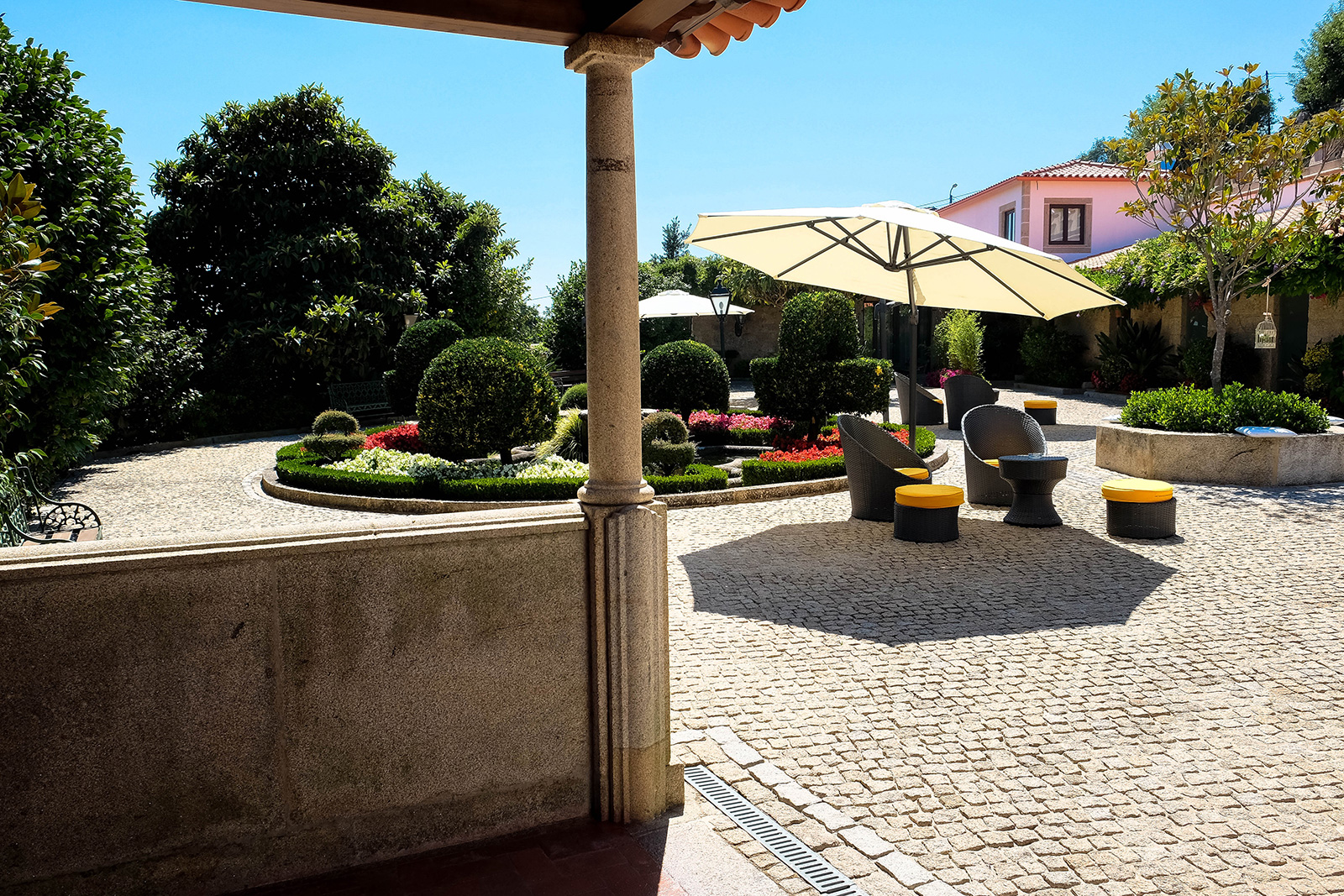 Pátio, acesso ao salão e acesso parque de estacionamento.